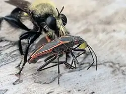 Female Laphria flavicollis eating a boxelder bug
