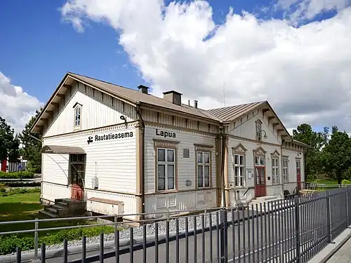 The Lapua railway station (Finnish: Lapuan rautatieasema, Swedish: Lappo järnvägsstation) is located in the central urban area of the town of Lapua, Finland. It is located along the Seinäjoki–Oulu railway, and its neighboring stations are Kauhava in the north and Seinäjoki in the south.