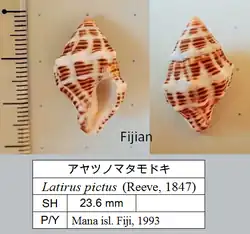Latirus pictus is a species of sea snail, a marine gastropod mollusc in the family Fasciolariidae, the spindle snails, the tulip snails and their allies.[1]