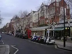 The street was built in 1875 and was named after a prominent Paddington resident the Earl of Lauderdale, an admiral in the Royal Navy.[1] Built some time after the streets to the south of it were laid out, it was not until the late nineteenth century and the Edwardian era that the area was completed. It features large red brick mansion blocks with apartments, in contrast to the area further south which featured the white stucco terracing of the early-to-mid Victorian era.[2] Typical of the style of the street, and surrounding area, is Lauderdale Mansions South. In 1896 the Lauderdale Road Synagogue was built in the street to serve the significant Jewish population in the area.[3] It was constructed in the Neo-Byzantine style and is now Grade II listed.[4][5]