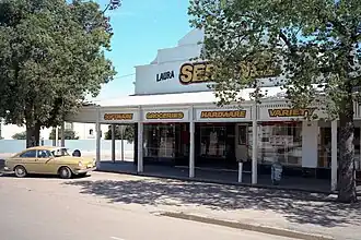 Laura is a rural town in the Mid North region of South Australia, 12 km north of Gladstone on the Horrocks Highway and 40 km east of Port Pirie. The first European to explore the district was Thomas Burr in September 1842. His promising reports soon led to occupation of the district by pastoralists, one of whom was Herbert Bristow Hughes (c. 1821 – 18 May 1892). When the present town was surveyed he named it for his wife, Laura née White (c. 1829 – 5 January 1909).[5]