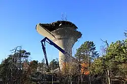 The Lauttasaari water tower was located on top of the Kotkavuori hill in Lauttasaari. It was built in 1958.[5]: 26  As soon as the tower was completed it became a local landmark, and later a kind of symbol of Lauttasaari.[2]: 68  The tower was the first mushroom-shaped water tower in Finland, and because of this, it was regarded as an architecturally and historically significant building.[3]: 1 [6] Several other mushroom-shaped water towers have later been built in Finland.[5]: 26