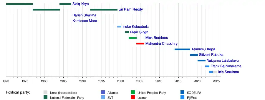 Inia SeruiratuFrank BainimaramaNaiqama LalabalavuSitiveni RabukaTeimumu KepaMahendra ChaudhryMick BeddoesPrem Singh (Fijian politician)Inoke KubuabolaKamisese MaraHarish SharmaJai Ram ReddySidiq Koya