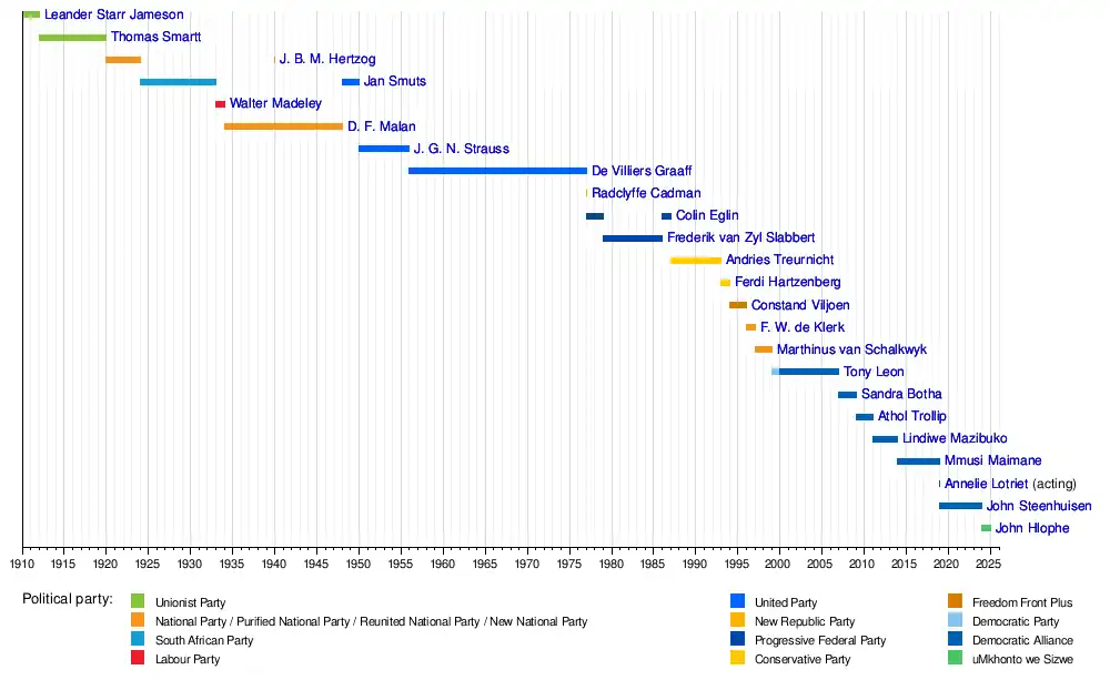 John HlopheJohn SteenhuisenAnnelie LotrietMmusi MaimaneLindiwe MazibukoAthol TrollipSandra BothaTony LeonMarthinus van SchalkwykF. W. de KlerkConstand ViljoenFerdi HartzenbergAndries TreurnichtFrederik van Zyl SlabbertColin EglinRadclyffe CadmanDe Villiers GraaffJacobus Gideon Nel StraussD. F. MalanWalter MadeleyJan SmutsJ. B. M. HertzogThomas SmarttLeander Starr Jameson