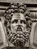On the west and north elevations of the building, the fourteen keystone heads were being sculpted by Catherine Mawer's husband Robert, between 1853 and 1854, when he died.[2][18] Catherine Mawer completed the masks, as well as the putti on the side panels of the main entrance and on the clock tower.[12] The four Portland stone lions on plinths along the frontage, an 1867 addition by the sculptor William Day Keyworth Jr,[17] contrast with the sandstone of the building itself, and were modelled at London Zoo.[19] The first two lions were unveiled on 15 February 1867, the soft Portland stone has subsequently eroded with the weather.[20]