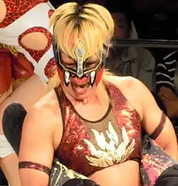 On August 27, 2011, Leon made her debut for the Universal Woman's Pro Wrestling Reina promotion with a win over Lady Afrodita.[106] During the following months, Leon continued working for Reina, remaining undefeated in singles matches.[107][108] On July 16, 2012, Leon made her debut for Universal Woman's Pro Wrestling Reina's follow-up promotion, Reina X World, teaming with Crazy Star in a tag team match, where they were defeated by Alex Lee and Manami Katsu.[109][110] On August 26, Leon entered a four-woman tournament to determine the inaugural Reina-CMLL International Champion. After picking up a win over Alex Lee in her first round match, Leon defeated Tiffany in the finals of the tournament to become the inaugural champion.[111][112] At the following event on September 23, Leon defeated CMLL-Reina International Junior Champion Silueta in a Two Out of Three Falls match.[113] On October 10, Leon made her first trip to Mexico to work for Consejo Mundial de Lucha Libre (CMLL), with which Reina X World has a working relationship.[114] Leon, billed as "León", wrestled her first match for CMLL on the October 12 Super Viernes show in Arena México in Mexico City, losing the Reina-CMLL International Championship to La Amapola in her first defense.[115][116][117][118] Two days later, in her second Arena México match, León teamed with Goya Kong and Marcela in a six-woman tag team match, where they defeated Mima Shimoda, La Seductora and Zeuxis.[119][120] The day after that in Puebla, León, Dark Angel and Lady Afrodita were defeated in a six-woman tag team match by La Amapola, Mima Shimoda and Princesa Blanca.[121] On October 16, Léon returned to Arena México for her fourth and final match of the tour, another six woman tag team match, where she, Dalys la Caribeña and Silueta were defeated by La Comandante, La Seductora and Princesa Sujei.[121] On November 25, Leon defeated La Amapola back in Japan to regain the Reina-CMLL International Championship.[122][123] Leon made her first successful title defense on February 10, 2013, defeating Sachie Abe at a JWP event.[124][125] Her second successful defense took place at an event held by the newly rebranded Reina Joshi Puroresu, where she defeated CMLL representative Estrellita.[126][127] On July 20, Leon lost the title to Command Bolshoi at a JWP event.[128][129] On August 24, Leon teamed with JWP rookie Rydeen Hagane, a replacement for an injured Ray, in a tournament for the vacant Reina World Tag Team Championship, with the two defeating Makoto and Miyako Matsumoto in their first round match.[130][131] On September 8, they were defeated in the finals of the tournament by La Vaquerita and Zeuxis.[132][133][134] On December 22, Leon and Ray defeated Aki Shizuku and Ariya to win the Reina World Tag Team Championship.[135][136] Leon and Ray vacated the title on March 28, 2014.[137]