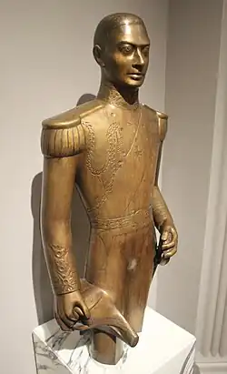 After returning to England in late 1928 Underwood made a number of paintings on Mexican themes, including imagined portraits of Montezuma II and Hernán Cortés, the latter holding a stone heart in front of a ruined castle.[13] He also created several surrealist paintings, six of which were shown at the first, and only, exhibition of The Neo Society held at the Godfrey Phillips Gallery in London in May 1930.[18] With funding from Eileen Agar, Underwood co-founded a graphical quarterly magazine, The Island, in 1931 which, despite contributions from Henry Moore, Agar, CRW Nevinson and Mahatma Gandhi was only published for four issues.[3][7][9][14][15][19] From 1932 to 1934, Underwood made a series of sculptures of dancing figures including Herald of New Day, the plaster cast of which is now in the Tate collection.[20] In 1934 he published an artistic manifesto, Art for Heaven's Sake: Notes on a Philosophy of Art.[21] Underwood was always convinced that subject matter formed a fundamental role behind the power of both his own and primitive art, and had no belief in subject-less or purely abstract form in his own work. Underwood's 1935 lignum vitae carving African Madonna, or Black Virgin, was inspired by a Bantu carving and is sited in St George's Cathedral, Cape Town.[22]