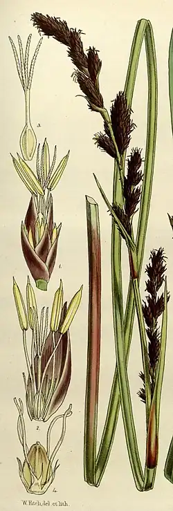 1. ^ a b c d Hooker, J.D. (1860). "Lepidosperma Oldfieldii". The Botany of the Antarctic Voyage of H.M. Discovery Ships Erebus and Terror. III. Flora Tasmaniae. 2 (7): 91. Plate CXLVI