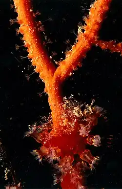 Leptogorgia sarmentosa with polyps extended, colonised by Alcyonium coralloides