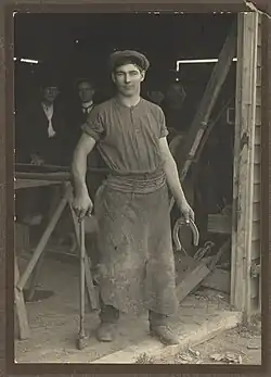 Les Darcy in the door of a blacksmith shop door", East Maitland, ca. 1910.