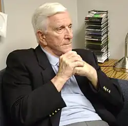 With Nielsen's American citizenship, he maintained his Canadian heritage: "There's no way you can be a Canadian and think you can lose it ... Canadians are a goodly group. They are very aware of caring and helping."[90] On May 19, 2005, when Queen Elizabeth II visited his native Saskatchewan during the province's centennial gala, she was introduced to Nielsen.[91]