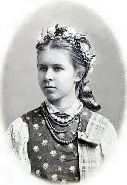 Lesya Ukrainka[1] (Ukrainian: Леся Українка, romanized: Lesia Ukrainka, pronounced [ˈlɛsʲɐ ʊkrɐˈjinkɐ]; born Larysa Petrivna Kosach, Ukrainian: Лариса Петрівна Косач; 25 February [O.S. 13 February] 1871 – 1 August [O.S. 19 July] 1913) was one of Ukrainian literature's foremost writers, best known for her poems and plays. She was also an active political, civil, and feminist activist.[2]