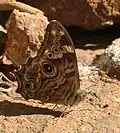 Male. Forewing: a costal and two preapical spots white. Hindwing: the ocelli (eyespots) of the underside showing through, sometimes forming two or three obscure black spots; two slender subterminal black lines. Underside paler, shaded with dark brown. Forewing: narrow subbasal and outer cellular transverse sinuous white lines; an irregular broad discal and a narrower postdiscal band white, forming a V, the latter bearing a series of four blind, dusky-black, fulvous-ringed ocelli; the two preapical white spots as on the upperside. Distinct slender subterminal whitish and broader terminal ochraceous lines. Hindwing: a subbasal transverse sinuous white line; a postdiscal arched series of six black ocelli, their centres disintegrated, their inner ring ochraceous, outer brown, and the whole series bordered inwardly and outwardly by lilacine (lilac-coloured) white lines; finally a slender white subterminal and a broader ochraceous terminal line as on the forewing.[3]