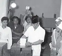 Under the cabinet, the long-awaited 1955 legislative and constitutional assembly elections took place. Rather than resolving political issues, the elections merely helped to draw the battle-lines more precisely.[20] Under Burhanuddin Harahap, harmonization between the government and the army began, as well as the termination of the Netherlands-Indonesia Union, as a form of protest over the West Irian issue. The cabinet resigned in early March.[21]