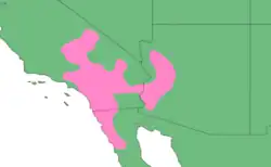 This species is found North of the US–Mexico border within San Diego County in California and along the coastal Peninsular Ranges, northward into the Mojave Desert and eastward in the Sonoran Desert of California and Arizona.[3] This species also occurs in southern Nevada.[1]