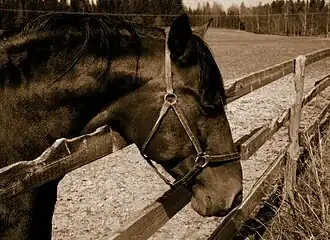 Horses often gnaw on wood rails, fences or boards as if they were food.[2] This has been linked with dietary deficiencies, and often can be remedied with a balanced diet or dietary supplementation.[3] Lignophagia in horses can be a cause of colic due to the ingestion of wood splinters,[3] and in severe cases, can cause excessive wearing and deterioration of the teeth.[4] A related vice is cribbing, wherein the horse grabs a wood board and sucks in air; not all wood-chewing is cribbing and though cribbing may also result in chewing on the wood surface, the two vices are not identical.[5]