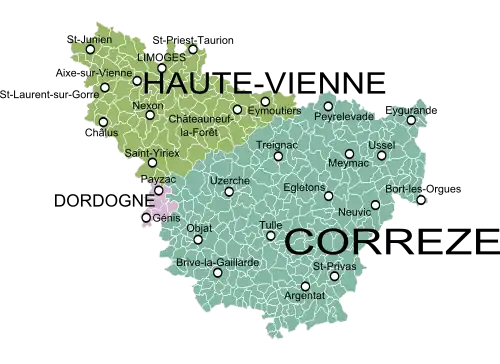 Map of the former province of Limousin, France, showing the communes according to the current administrative division.