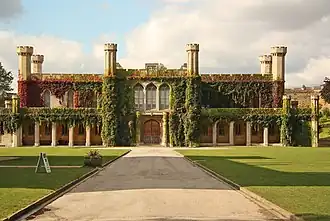 The current building, which was designed by Sir Robert Smirke in the Gothic style and built at a cost of £40,000, was completed in 1823.[1][4][5] The design involved a symmetrical main frontage with thirteen bays facing the east gate of the castle; the central section of three bays featured an arched doorway with a triple Gothic window on the first floor; the roof was crenellated and there were octagonal corner turrets.[1] Internally, the principal rooms in the building were the two courtrooms, one for hearing criminal cases and the other for hearing civil cases, both approximately square, decorated with wainscot panelling and located on the first floor.[1] There was also a grand jury room containing an ornate fireplace guarded by lions bearing shields.[5]