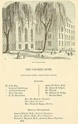 Lincoln Hospital was founded in 1839 as "The Home for the Colored Aged" by a group of prominent philanthropists known as the "Society for the Relief of Worthy Aged Indigent Colored Persons."[2] The hospital's function gradually became the most important aspect of the operation, and in 1882, the name was changed to "The Colored Home and Hospital."[2]