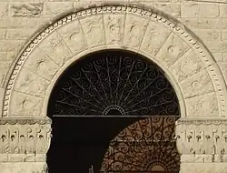 The building was designed in the Richardsonian Romanesque style. The exterior, which was composed of red brick and Anamosa Limestone and Bedford limestone, featured simple and bold massing. A flared and rusticated limestone base reinforced the visual weightiness of the building. A bell tower was constructed in brick on the front of the building and was removed in the 1940s.[2] It featured stone quoining. A recessed entry was located below an archway that featured wrought-iron scrollwork.