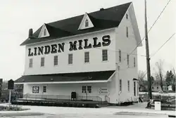 Two mills were first built in Linden in 1837 and 1838. These burned, and in 1850, Seth C. Sadler and M. Warren bought the mill sites and constructed the present gristmill as well as a saw mill located across the river. These mills were operated together, and known as the "Linden Mills." By 1864, Linden had 450 inhabitants, and multiple businesses that depended on the mills, such as furniture manufacturers, makers of, staves and carriages, and a grain elevator. The saw mill burned down during the Civil War, but was soon rebuilt. In 1864, Israel B. Hyatt purchased the mills, and in about 1880 Myron Harris took over.[3]