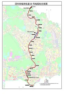 Line 22 of the Shenzhen Metro is an express line under construction, which will connect the districts of Futian, Longhua and Longgang for 38 kilometers and 23 stations.[1] Construction began on 2 January 2024,[2] and the line is expected to open in 2028. The first phase of Line 22 will run from Shangsha in Futian District to Liguang in Longhua District, with 21 stations and 34.2 kilometers of track.[3][4] The line is proposed to use 6 car type A trains.[5] It is proposed to extend into Dongguan in long term planning.