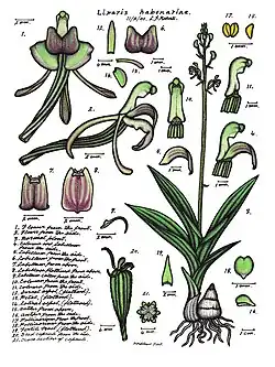 The common sphinx orchid was first formally described in 1864 by Ferdinand von Mueller who gave it the name Sturmia habenarina and published the description in Fragmenta phytographiae Australiae. The description was based on a specimen collected near Rockingham Bay by John Dallachy. In the description, von Mueller noted Liparis habenarina as a synonym.[6][7] In 1873, George Bentham changed the name to Liparis habenarina and published the name change in Flora Australiensis.[8][9] The specific epithet (habenarina) refers to the similarity of this species to those in the orchid genus Habenaria.[2]