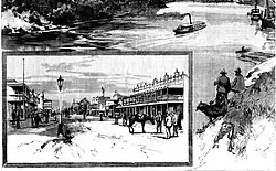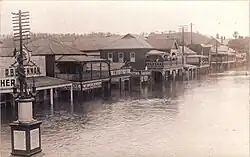 At the beginning of the 20th century, river navigation was still the mainstay of transportation in Lismore, the principal operator being the North Coast Steam Navigation Company. The dairy industry was performing strongly, employing hundreds of small family-owned operations, the Lismore region becoming the centre for dairy production from the surrounding farms and the richest dairy district in Australia.[13] The railway station had opened in 1894 as the starting point of the Murwillumbah railway line which, starting at that time in Lismore, ran to the coast at Byron Bay (from which steamers could be caught to Sydney) and then on to Murwillumbah, and subsequently in 1903 inland to Casino, but was not connected to any national network. However, as the century progressed, development of a better road network and the advance of motor transportation made inroads into the long-term success of both the river and rail traffic which eventually declined: river traffic was also affected by requisitioning of ships during the second world war and the largest shipping line operating on the two arms of the Richmond River, the North Coast Steam Navigation Company, went into liquidation in 1954; the railway line lasted until 2004 when it was closed on purely economic grounds after advising that it was "unprofitable" to continue providing services to Murwillumbah, putting an end to 110 years of rail transport in the region.[14] Meanwhile, economic development in Lismore continued, including construction of a new School of Arts (1907, destroyed by fire in 1932), building of churches for four denominations, opening of a new Norco (dairy farmers' cooperative) factory in 1931, and other utilities.