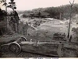 From the 1840s onwards, timber cutters moved up the Richmond River from its Ballina entrance felling timber from the extensive, previously untouched subtropical rainforest covering the region known as the "Big Scrub"; their primary interest was the Australian red cedar, Toona ciliata, known locally as "red gold", which was highly prized for its appearance, ease of working, and pest resistance. At that time there was no substantial network of roads so rivers were the primary means of access and bulk transportation. Despite its low-lying position and propensity for flooding (which was to cause problems in subsequent times), Lismore developed as an inland port owing to its location at the highest navigable point for large cargo-carrying vessels on the north arm of the Richmond, later renamed the Wilsons, River. For the second half of the 19th century the primary industries of the Lismore region continued to be cattle grazing and timber, supporting a growing economy and population and the development of secondary industries which included ship building, transportation, saw milling, tallow manufacturing and more.[13] As the Big Scrub was cleared, it was steadily replaced with new pasture which formed the basis of a flourishing dairy industry, and many processing plants ("butter factories") and dairy cooperatives were established throughout the region. Infrastructure development in Lismore continued, including the presence of three schools by 1879, a new Government Wharf in 1880, two new bridges over the river in 1884 and 1885, the railway station (1894) and a new post office building (1898); by the end of that century Lismore had a population of over 4,500, although had suffered from some ravages including numerous floods plus a period of drought in the last half of the 1890s.[13]