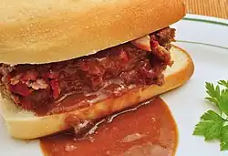 Italian beef Chicago Seasoned roast beef, dripping with meat juices, on an Italian-style roll, often served with peppers