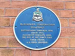 Jubilee Street, Blackburn 53°44′47″N 2°14′53″W / 53.74633°N 2.248054°W / 53.74633; -2.248054 Blackburn Corporation Tramways. Electrification commenced here March, 1899. Electricity generated here, the site of the town's first power station. A.S. Giles, Engineer.