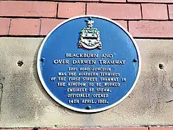 Postal Order, 15 - 19 Darwen Street, Blackburn 53°44′48″N 2°28′57″W / 53.74668°N 2.48251°W / 53.74668; -2.48251 Blackburn and Over Darwen Tramway. This road junction was the northern terminus of the first street tramway in the kingdom to be worked entirely by steam, officially opened 14th April, 1881.