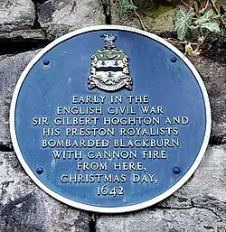 6 Adelaide Terrace, Blackburn 53°45′07″N 2°29′45″W / 53.75206°N 2.49572°W / 53.75206; -2.49572 Early in the English Civil War, Sir Gilbert Hoghton and his Preston Royalists bombarded Blackburn with cannon fire from here, Christmas Day, 1642