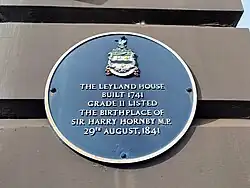 King Street, Blackburn 53°44′50″N 2°29′05″W / 53.74734°N 2.48479°W / 53.74734; -2.48479 The Leyland House, built 1741. Grade II listed. The birthplace of Sir Harry Hornby M.P. 29th August, 1841.