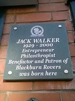 Jack Walker 1929 - 2000. Entrepreneur, philanthropist, benefactor, and patron of Blackburn Rovers was born here.