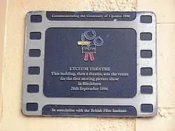 Commemorating the Centenary of Cinema 1996. Lyceum Theatre. This building, then a theatre, was the venue for the first moving picture show in Blackburn. 28th September 1896. In association with the British Film Institute