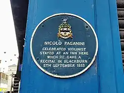 Paganini Inn, Lord Street, Blackburn 53°44′57″N 2°29′08″W / 53.74918°N 2.48559°W / 53.74918; -2.48559 Nicolò Paganini celebrated violinist stayed at an inn here when he gave a recital in Blackburn 5th September 1833.