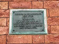 Mill Lane, Blackburn 53°44′45″N 2°29′02″W / 53.74582°N 2.48380°W / 53.74582; -2.48380 Here, on 24 February 1865, was born William Wolstenholme MUS.BAC (OXON) F.R.C.O. -HON.CAUSA-, the gifted blind organist and composer.