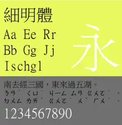 | MingLiU | 細明體 | TC (Taiwan) | Microsoft Windows | mingliu.ttc