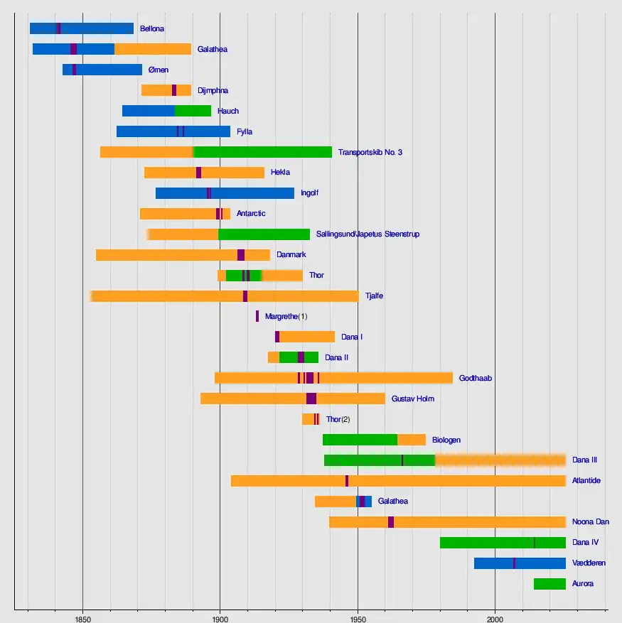 Overview of ships which serve or has served as Danish research ships. Also indicated are ships purchased specifically for major Danish funded expeditions.