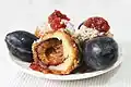 A hard-boiled egg that has been shelled, cut in half, and filled with a paste made from an egg yolk mixed with other ingredients such as mayonnaise and mustard. | |