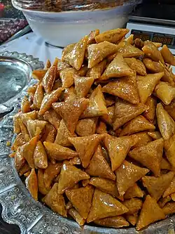 Dessert Triangular or cylinder-shaped savory or sweet pastry covered with warqa (a paper-thin Moroccan dough)[2][3] and stuffed with almond paste.[3]
