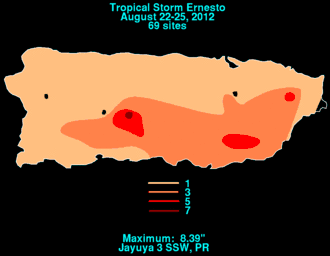 - August 4 - In Puerto Rico, some areas experienced locally heavy rainfall due to Tropical Storm Ernesto, especially the southern half of the island. The heaviest amount of precipitation observed was 8.39 in (213 mm) near Jayuya.[87] A few mudslides occurred and some streets flooded, leaving at least three cars stranded.[88]