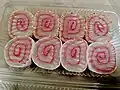 印花粄 (yìnhuābǎn)[11] Hakka-style sweet snack; white and round, with an embossed print on the top surface