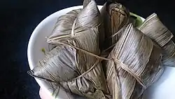Zong Zongzi Zongzi Two types: sweet (Hakka-style) and salty (Cantonese-style); the sweet version is eaten with peanut powder. Wrapped in fatak leaves.[12]