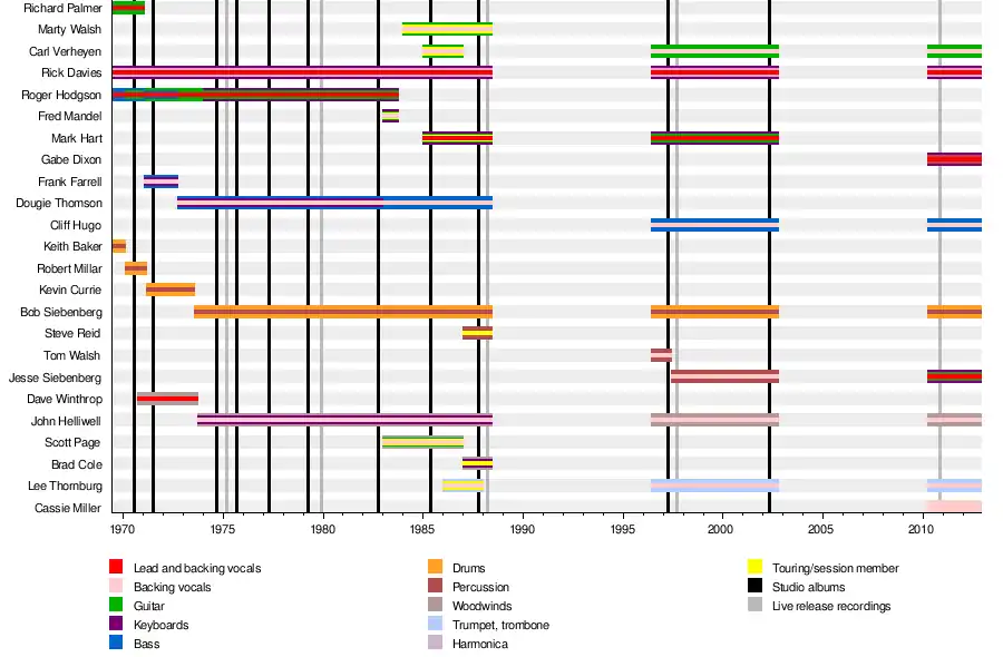 Davies and Hodgson rebuilt Supertramp in 1973, bringing in new members Dougie Thomson on bass, Bob Siebenberg on drums and John Helliwell on saxophone and woodwind instruments, who together released the band's "breakthrough" album Crime of the Century in 1974.[3] This lineup remained stable for a total of ten years, until Hodgson left in 1983 following a period of "musical differences" with the rest of the group, mainly Davies.[4] The group continued as a four-piece with touring musicians following Hodgson's departure, releasing the less successful Brother Where You Bound in 1985 and Free as a Bird in 1987, before breaking up the following year.[5]
