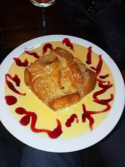 Bread and butter pudding served with custard