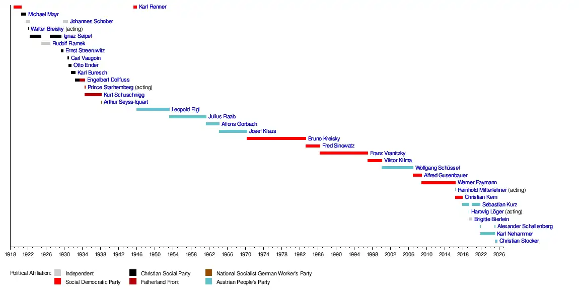 Christian StockerKarl NehammerAlexander SchallenbergBrigitte BierleinHartwig LögerSebastian KurzChristian KernReinhold MitterlehnerWerner FaymannAlfred GusenbauerWolfgang SchüsselFranz VranitzkyFred SinowatzBruno KreiskyJosef KlausAlfons GorbachJulius RaabLeopold FiglKurt SchuschniggErnst Rüdiger StarhembergEngelbert DollfussKarl BureschOtto EnderCarl VaugoinErnst StreeruwitzRudolf RamekIgnaz SeipelWalter BreiskyJohannes SchoberMichael MayrKarl Renner