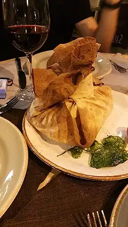 - Khurjin (խուրջին) — Armenian dish named after a traditional saddlebag, reflecting its distinctive pouch-like shape. Resembling an oversized khinkali when only focusing on Its looks, it is made by filling a round sheet of thin dough with grilled meat, vegetables, herbs and spices, then gathering and twisting the edges at the top to seal it like a bundle. The khurjin is then baked until golden, holding in all the juices. When served, it is often sliced open to reveal the steaming filling inside.[30][31][32][33]