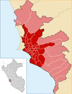 The province of Lima is divided into forty-three districts of Lima (Spanish: distritos), which are administered by the Metropolitan Municipality of Lima.[1] The urban area of Lima is generally considered to be formed by thirty of these districts. The remaining thirteen districts consist of mostly rural and sparsely populated desert and mountainous areas. Of these peripheral districts, many of the coastal ones serve as beach resorts and their population, which is considerably smaller than that of the urban districts, increases during the summer months.